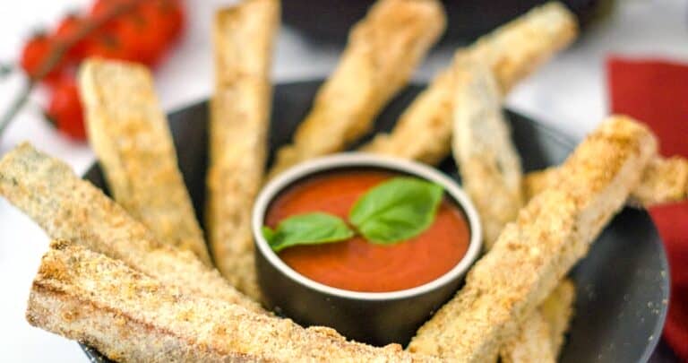 Crispy eggplant fries have a garlic almond flour coating and are cooked in the air fryer for a delicious appetizer or side dish.