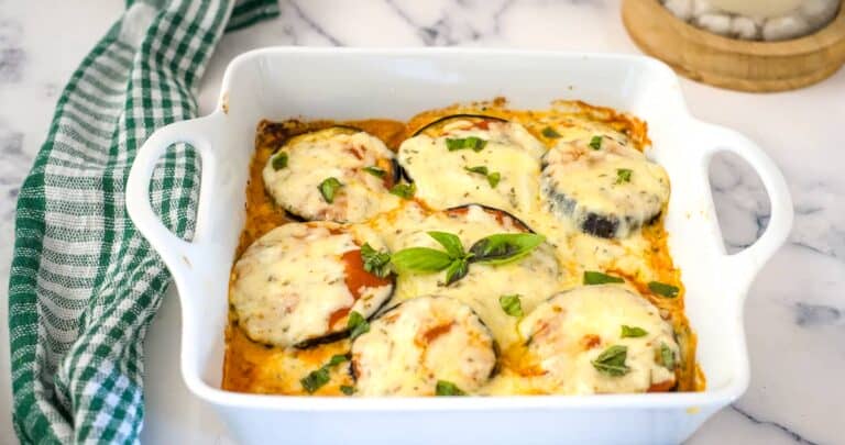 This baked eggplant parmigiana is so simple and tastes like a light version of lasagne but fresher. It is pasta free version of lasagna.