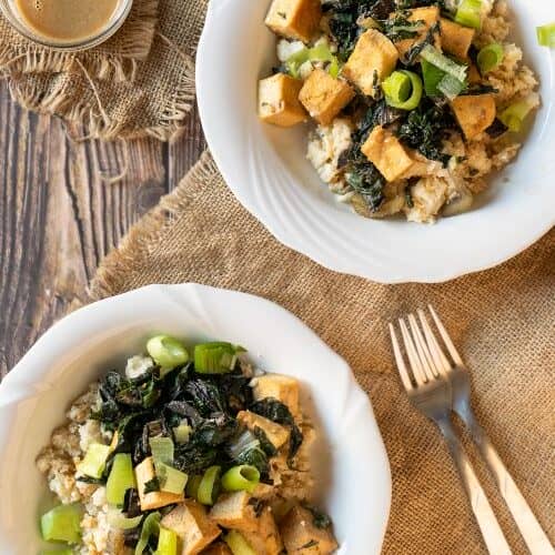 - Serve the cauliflower rice topped with the tofu and bok choy, drizzling with extra sauce and garnishing with sliced green onion.
